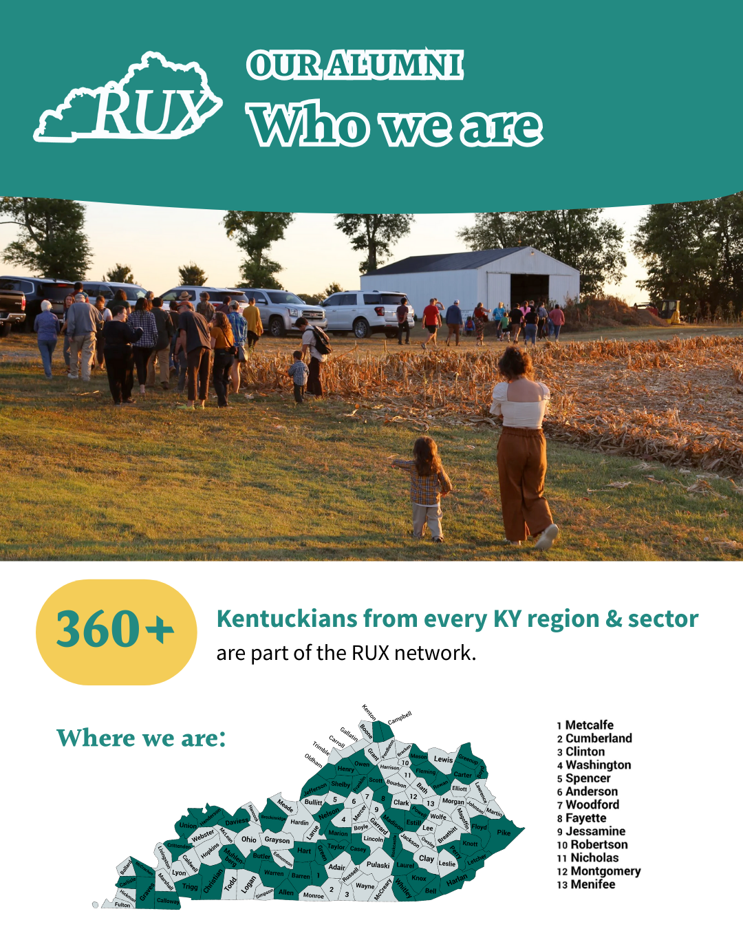 Access to an exclusive digital community that shares network opportunities & gatherings across the state.An initiative of Art of the Rural, the Kentucky Rural-Urban Exchange (RUX) unites Kentuckians in common purpose through experiences & cross-sector projects that strengthen intercultural leadership and solidify civic health.