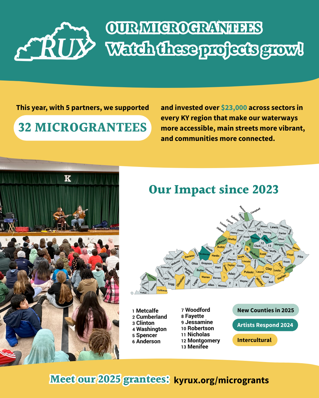 With 5 partners, we supported 32 micrograntees and invested over $23,000 across sectors in every KY region that make our waterways more accessible, main streets more vibrant, and communities more connected. Since 2023, our Microgrant Program has distributed over $88,000 to 53 projects in 33 counties throughout our Commonwealth!