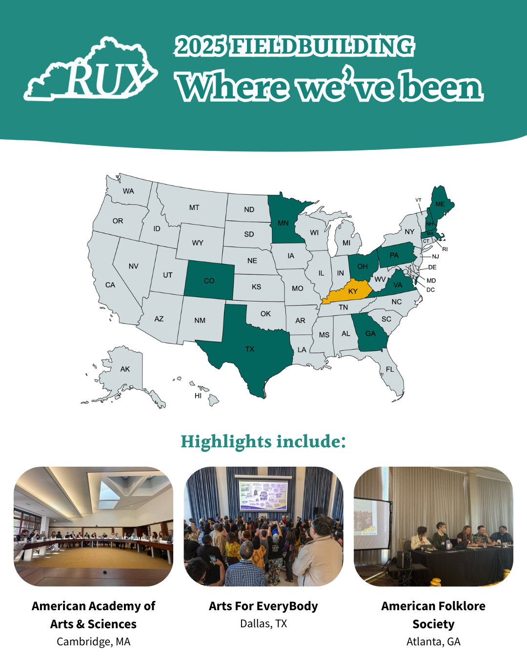 We are continuing to build a statewide commitment to civic health, and a nationwide brand for a Kentucky where innovation thrives in diverse contexts. RUX traveled to Colorado, Georgia, Massachusetts, Minnesota, New Hampshire, Ohio, Pennsylvania, Texas, and Virginia this year, where we shared the stories and lessons KY has learned together.